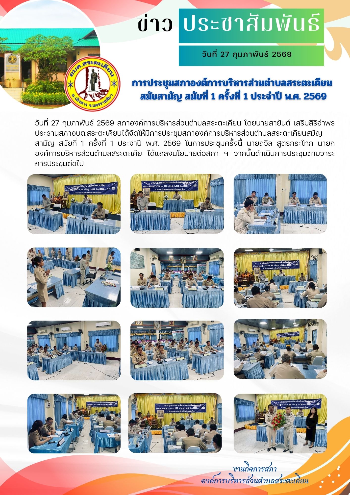 วันที่ 27 กุมภาพันธ์ 2569 สภาองค์การบริหารส่วนตำบลสระตะเคียน โดยนายสายันต์ เสริมสิริอำพร ประธานสภาอบต.สระตะเคียนได้จัดให้มีการประชุมสภาองค์การบริหารส่วนตำบลสระตะเคียนสมัญสามัญ สมัยที่ 1 ครั้งที่ 1 ประจำปี พ.ศ. 2569 ในการประชุมครั้งนีิ้ นายถวิล สูตรกระโทก นายกองค์การบริหารส่วนตำบลสระตะเคีย ได้แถลงนโยบายต่อสภา ฯ จากนั้นดำเนินการประชุมตามวาระการประชุมต่อไป
