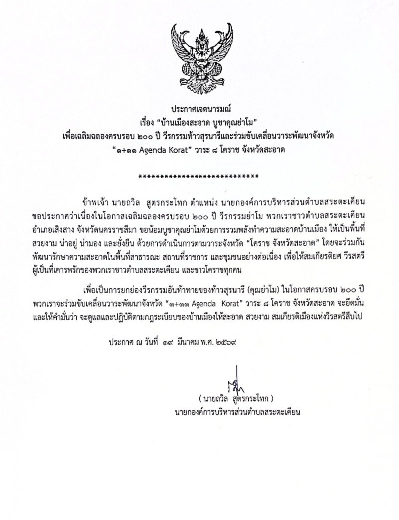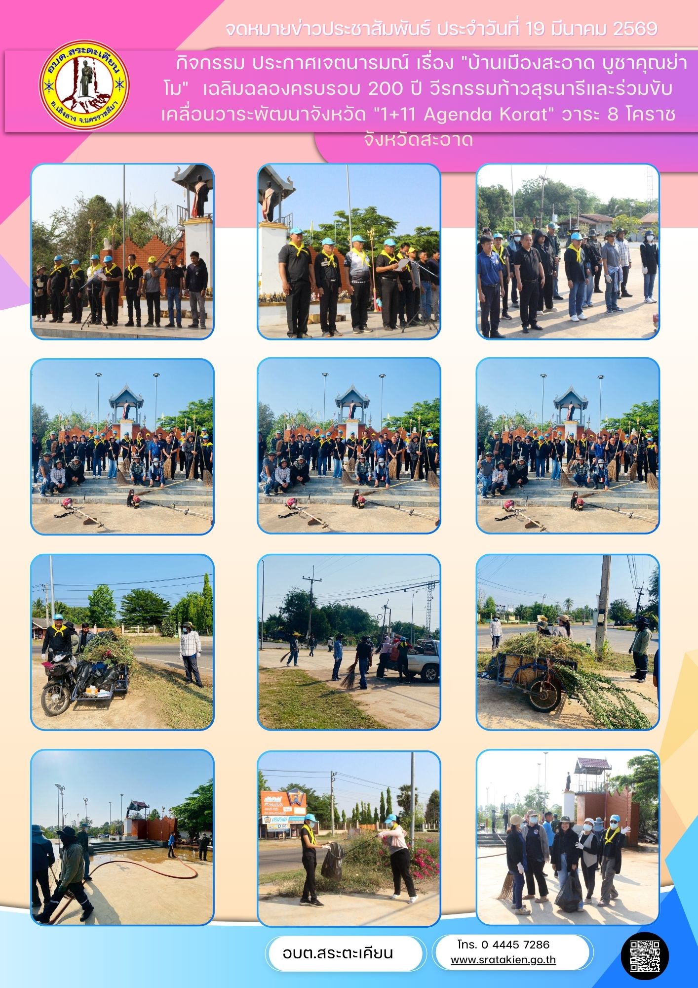 วันที่ 19 มีนาคม 2569 เวลา 08.30 น. นายถวิล สูตรกระโทก นายกองค์การบริหารส่วนตำบลสระตะเคียน ได้กล่าวประกาศเจตนารมณ์ เรื่อง "บ้านเมืองสะอาด บูชาคุณย่าโม" เฉลิมฉลองครบรอบ 200 ปี วีรกรรมท้าวสุรนารีและร่วมขับเคลื่อนวาระพัฒนาจังหวัด "1+11 Agenda Korat" วาระ 8 โคราชจังหวัดสะอาด และนำคณะบริหาร สมาชิกสภาองค์การบริหารส่วนตำบลสระตะเคียนพนักงานส่วนตำบลลูกจ้างประจำและพนักงานจ้างองค์การบริหารส่วนตำบลสระตะเคียน ทำกิจกรรม 5 ส. (Big Cleaning Day) ร่วมกันทำความสะอาด ประภูมิทัศน์บริเวน ลานอนุสาวรีย์ท้าวสุรนารีย องค์ประจำตำบลสระตะเคียน และถนนเส้น แยกบ้านโคกไม้ตาย - ที่ทำการ อบต.สระตะเคียน